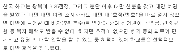 자식 고생 안 시킬려고 계속 화교로 살지만, 한국인의 권리혜택을 못받아서 불편하지.
