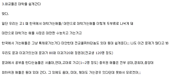 P.S : 물론 화교가 100%명문대학교에 모두 입학한다고 하더라도, 한국인 명문대입학생과 동등한 취업률을 보이진 않는다.