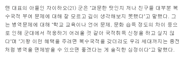 이건 안 좋다. 군대에 가고 싶은 사람만 가도록 하는 이중국적으로 설정해달라."